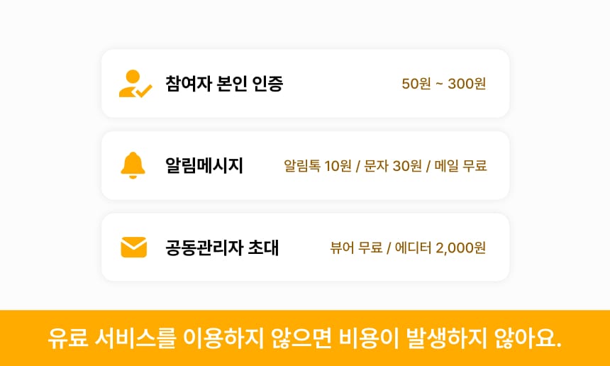 여러분이 불합리한 금액을 부담하지 않도록, 치즈버튼은 표당 가격제를 해체하고 유료 서비스를 필요한 만큼만 선택해서 사용할 수 있게 했어요. 치즈버튼 유료 서비스는 1) 참여자 본인 인증 서비스, 2) 알림 메시지 발송 서비스, 3) 공동관리자 초대 서비스를 지원하고 있어요. 유료 서비스를 신청하지 않으면 투표 서비스를 무료로 이용할 수 있으니 안심하세요.