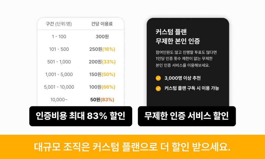 유료 서비스 이용 요금에 대한 부담을 덜어드리기 위해 참여자 본인 인증 서비스 이용료를 최대 83% 할인해 드려요. 참여자 수가 많아질수록 1인당 인증 요금이 저렴해져요. 참여 인원도, 진행할 투표도 많다면 1인당 인증 횟수 제한이 없는 무제한 본인 인증 서비스를 할인가에 제공해 드려요. 무제한 본인 인증 서비스는 커스텀 플랜 구독 시 제공돼요.