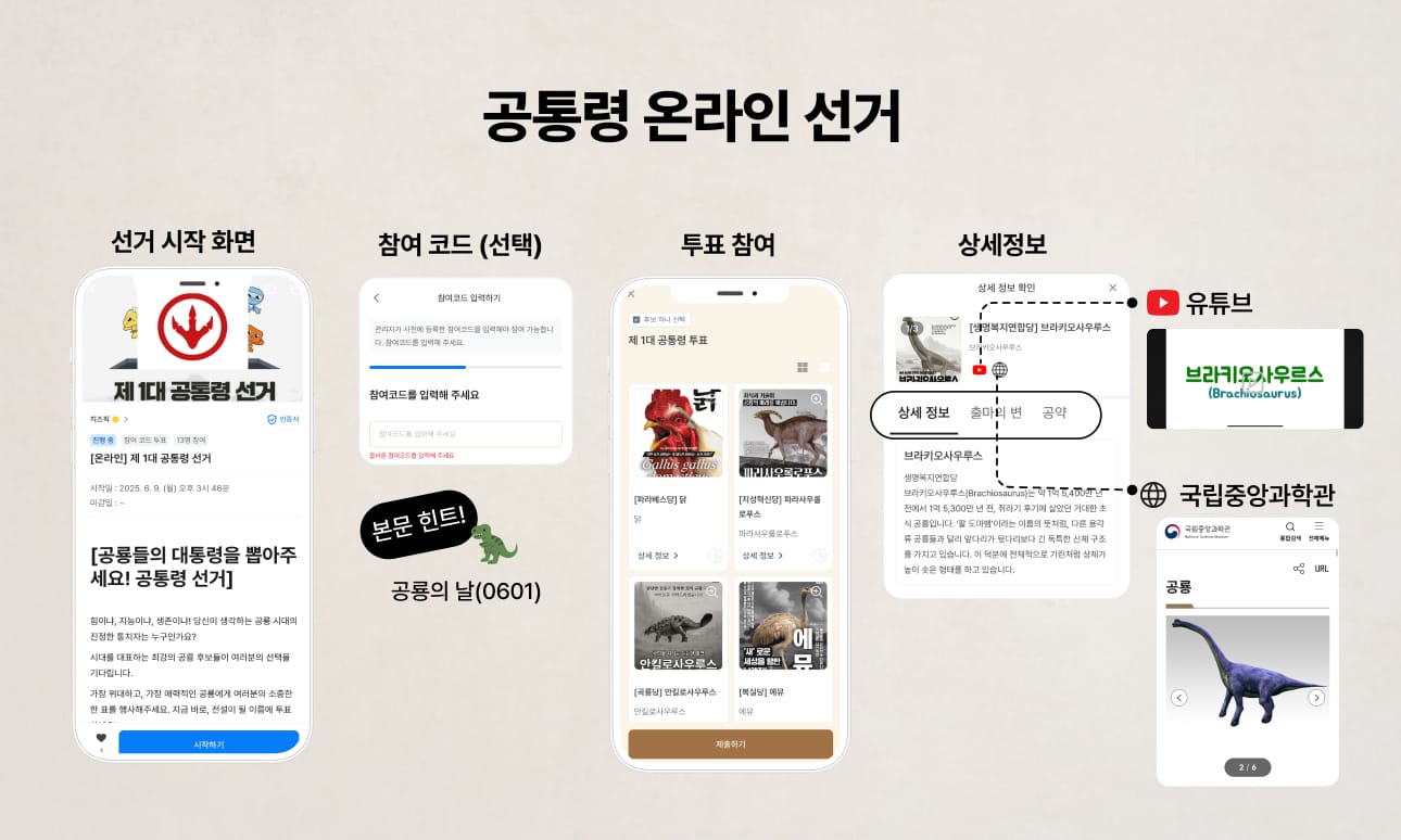 “공룡들의 대통령을 뽑아주세요!” 같은 문구로 참여를 유도하고, 선거 기간, 참여 방법, 유의사항 등을 간략하게 정리해두었죠.