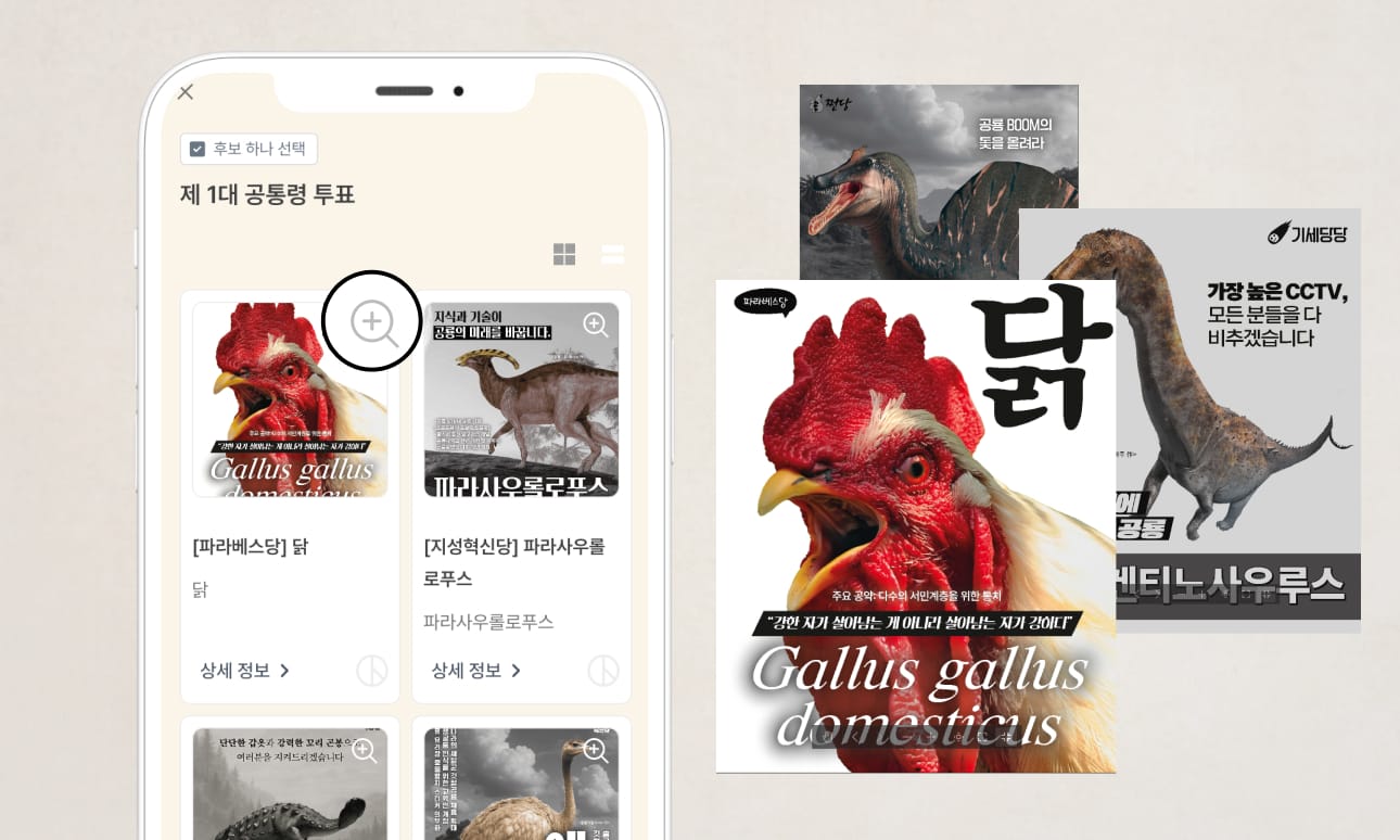 단순한 인기투표일 거라고요? 천만에요. 각 후보에겐 슬로건과 공약은 물론, 각양각색의 정당명과 유세 포스터까지 준비돼 있었어요. 어떤 후보는 평화를 외쳤고 어떤 후보는 강력한 힘으로 백악기를 통치하겠다는 포부를 드러냈죠.