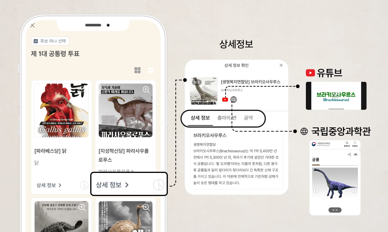 그리고 투표 중 “이 공룡 진짜 어떤 애지?” 궁금해질 수 있잖아요? 그럴 땐 바로 탐색할 수 있도록, 유튜브 소개 영상과 국립중앙과학관의 설명 페이지로 연결되는 링크도 함께 넣었어요.