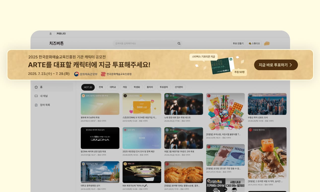 공모전의 최종 심사를 대국민 투표로 준비하고 계신가요? 치즈버튼과 함께라면 공정한 운영은 물론 더 많은 참여를 이끌어내는 생동감 있는 투표를 만들 수 있어요.