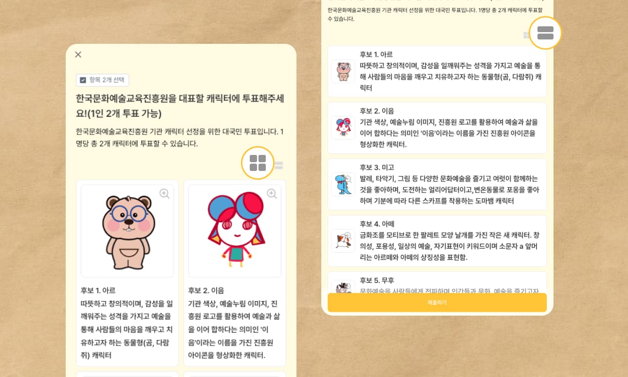 이번 캐릭터 공모전에는 무려 283개의 개성 넘치는 캐릭터 작품이 접수됐어요. 그중 1차 심사를 통과한 40개의 후보 캐릭터를 대상으로 최종 선정을 위한 대국민 투표가 열렸어요. 투표는 7월 23일부터 29일까지 치즈버튼 플랫폼에서 진행됐고 국민 누구나 참여할 수 있었어요.