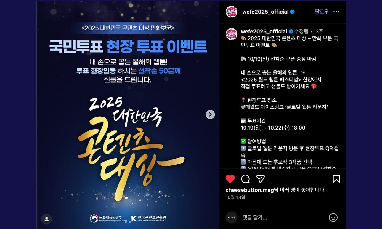 치즈버튼과 함께한 이번 대한민국 콘텐츠대상 만화부문 국민투표는 팬 참여 중심의 문화 행사가 어떻게 공정하고, 즐겁게 운영될 수 있는지 보여준 사례였습니다.