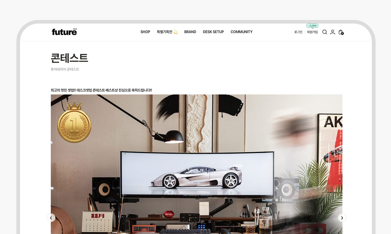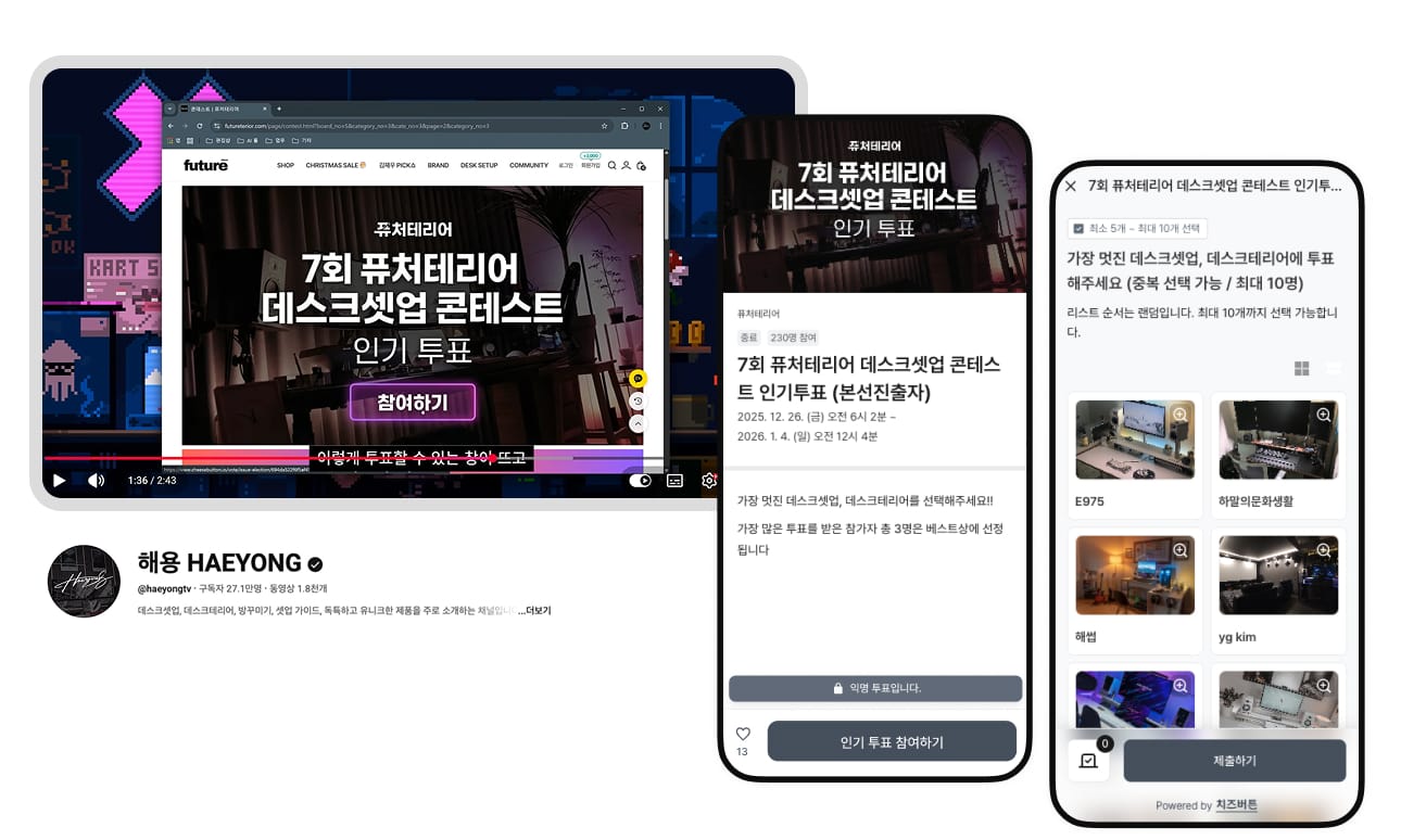 ‘퓨처테리어 셋업 콘테스트’는 바로 이러한 채널의 정체성 위에서 탄생한 구독자 참여형 콘텐츠입니다. 구독자들이 직접 데스크 셋업 인테리어 아이디어를 출품하고, 커뮤니티 투표를 통해 베스트 작품을 선정하는 방식이에요. 이는 팬이 단순 소비자가 아닌 콘텐츠의 주체가 되어 참여하는 경험을 제공하고, ‘데스크셋업’이라는 채널의 정체성과 팬 커뮤니티를 동시에 강화하는 구조를 만든 셈입니다.