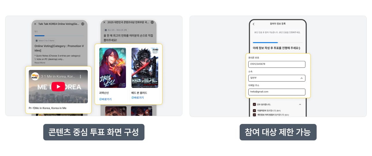 이미지·영상 중심 투표부터, 심사·평가까지 다양한 콘텐츠를 만들 수 있어요. 제목·커버 이미지·본문 구성(콘텐츠/안내)을 한 화면에 제공하여, 투표 및 심사에 필요한 정보 전달에 더욱 효과적입니다. 이벤트의 성격에 맞게 CTA 버튼도 커스텀이 가능해요.