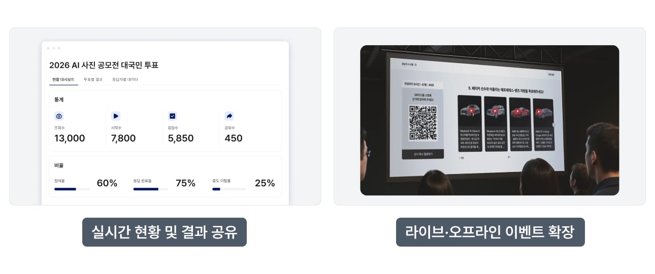 온라인 투표 참여를 오프라인으로 연계하여 이벤트를 확장할 수 있어요. 행사 현장에서 QR 코드를 통해 참여를 유도하거나, 화면 송출을 통해 실시간으로 투표 현황을 살펴볼 수 있죠.