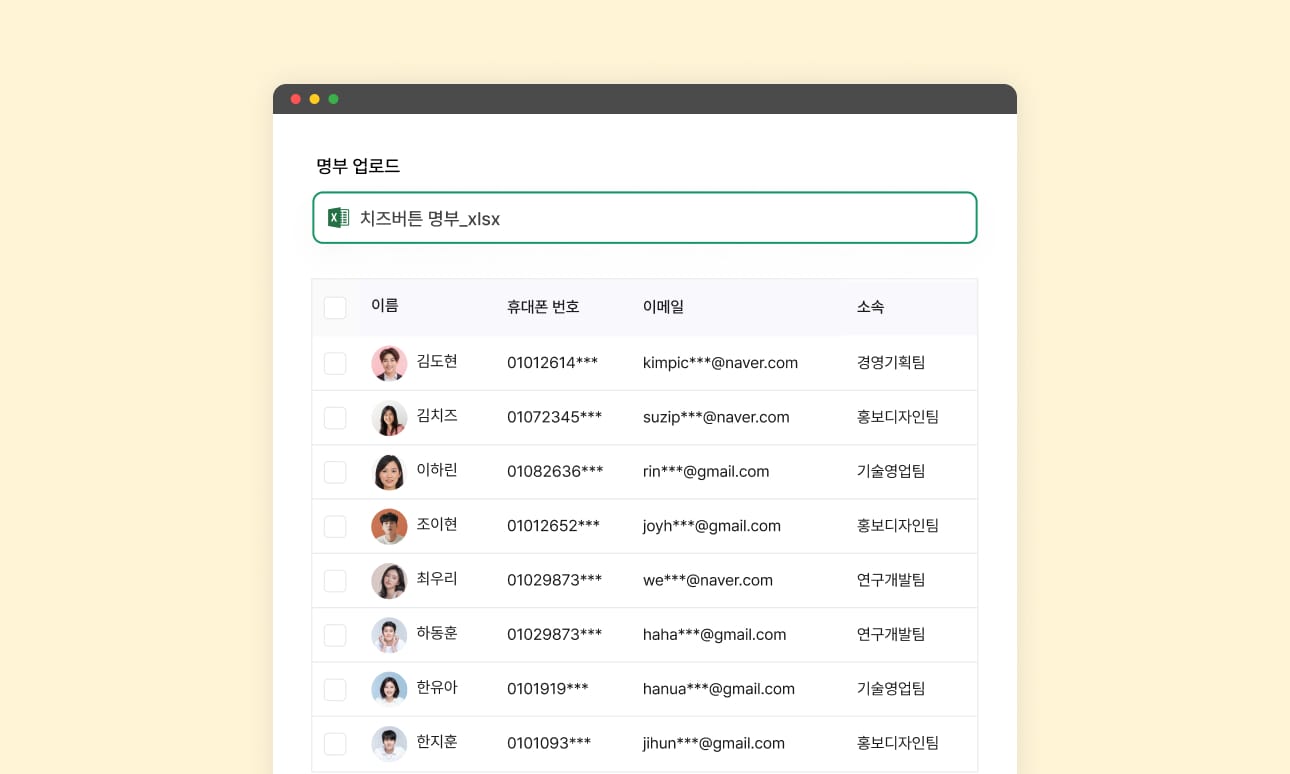 치즈버튼은 엑셀 파일을 통째로 업로드해서 명단을 만듭니다. 한 명씩 입력할 필요가 없어요.