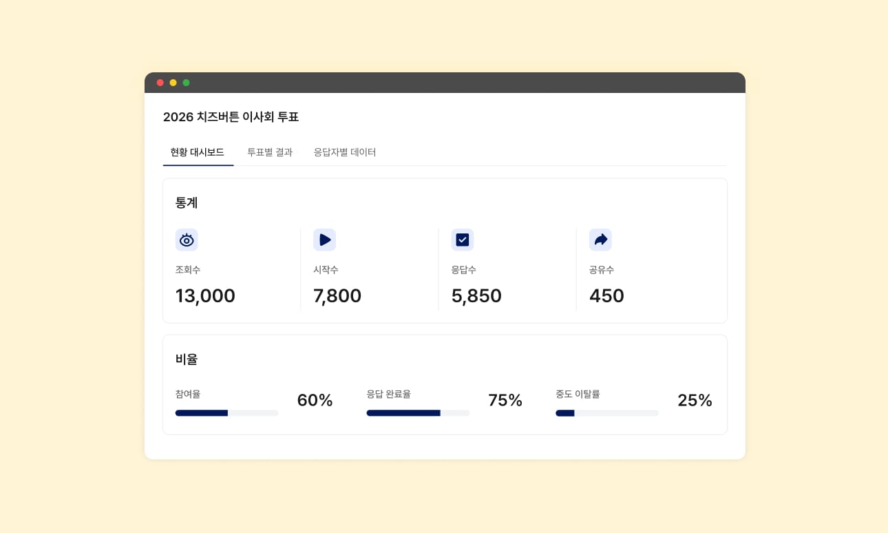 - 관리자는 참여자 명단을 만들고, 투표를 개설하고, 결과를 관리합니다. 치즈버튼 계정이 필요해요.