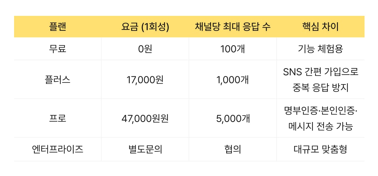 2024년 9월 정책 개편으로 플랜별 최대 응답 수 한도가 적용됩니다. 대규모 투표가 예상될 경우, 결제 전 각 플랜의 응답 가능 인원을 반드시 확인해 주세요.