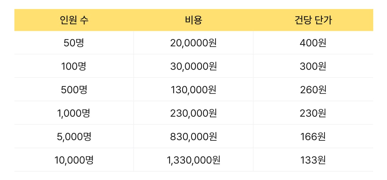 참여자 인증 요금은 한 번에 많이 구매할수록 구간별 할인율이 높아집니다. 예상 참여 인원을 넉넉히 파악해 일괄 결제하시는 것이 가장 경제적입니다.