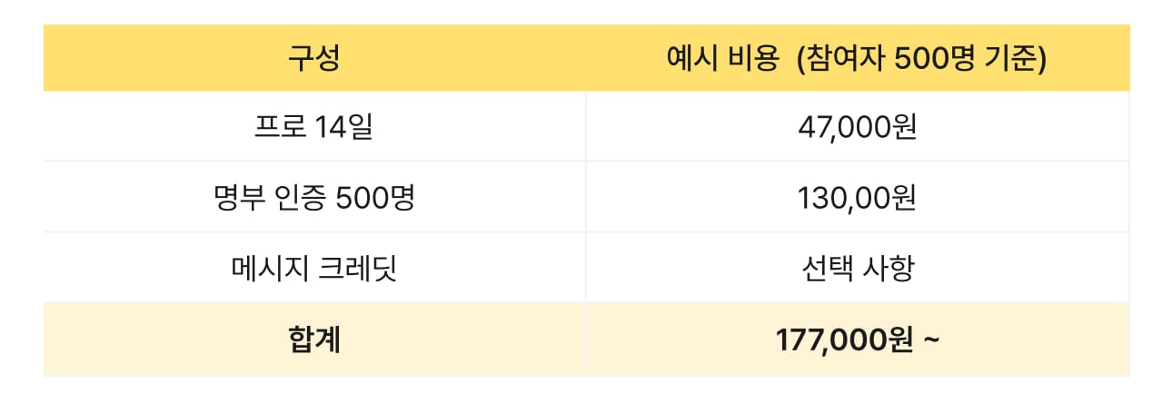 추천: 프로 플랜 + 참여자 인증(명부인증) + 메시지 전송 크레딧(선택)