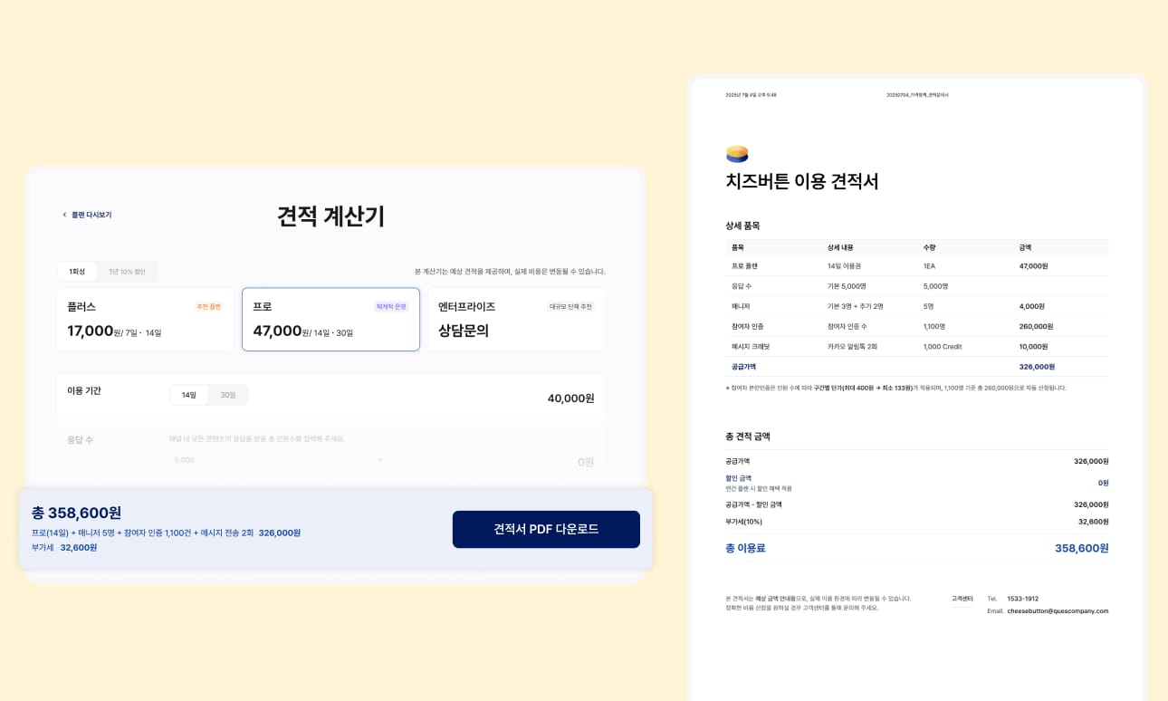 치즈버튼은 플랜·참여 인원·기간 조건을 직접 입력하면 예상 금액을 바로 산출해주는 견적 계산기를 제공하고 있어요. 위 케이스 예시에서 확인한 구성을 그대로 계산기에 넣어보시면 내 상황에 맞는 실제 금액을 바로 확인할 수 있습니다.