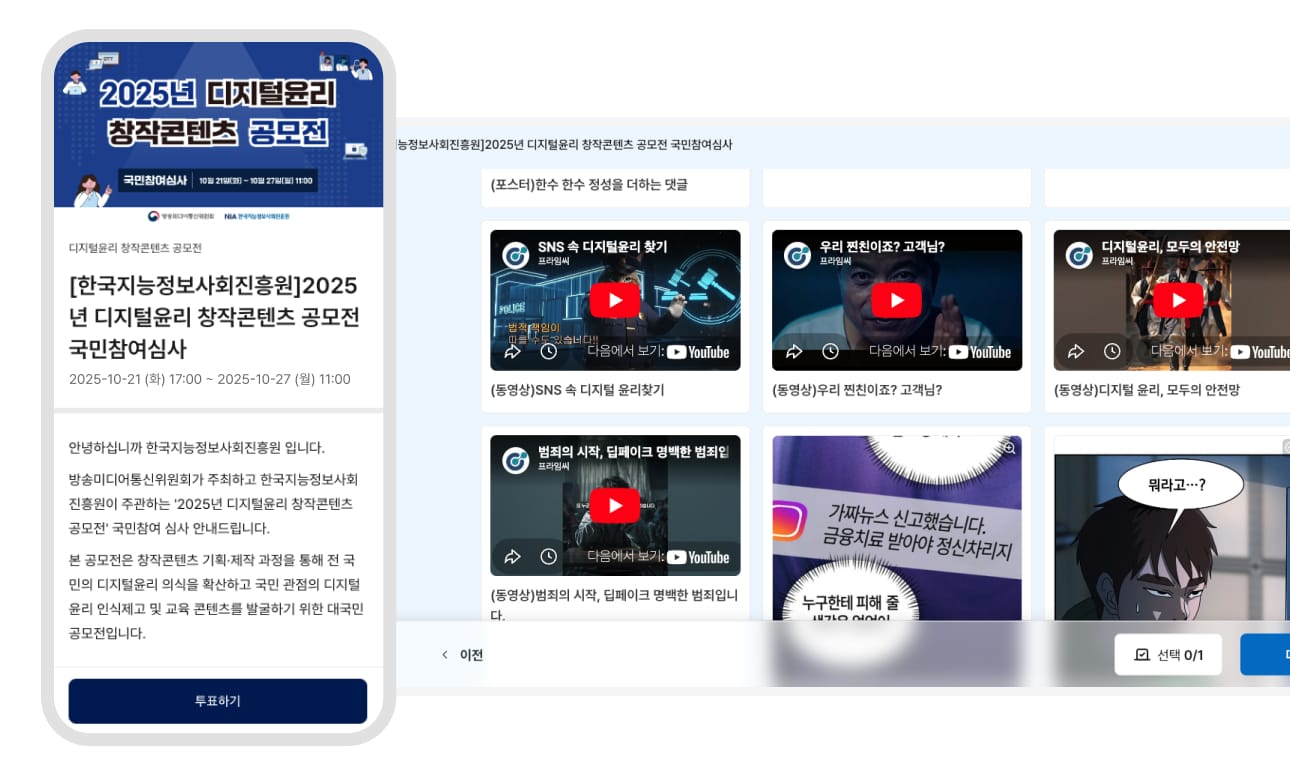 - 도입 배경: 방송미디어통신위원회 주최, 한국지능정보사회진흥원 주관으로 진행된 공모전으로, 초·중·고, 성인 등 4개 대상별 디지털윤리 인식 제고 콘텐츠 공모전의 수상작 선정을 위해 대국민 참여 심사를 도입했어요.