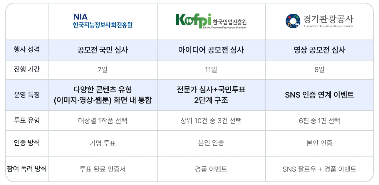 ③ 투표 인증서 발급 + SNS 이벤트 연계 — 투표 참여 자체를 SNS 콘텐츠로 활용하여, 자발적 확산을 유도했어요. ‘경기관광공사’는 투표 참여 유도와 브랜드 인지도 향상의 목적을 동시에 달성했어요.